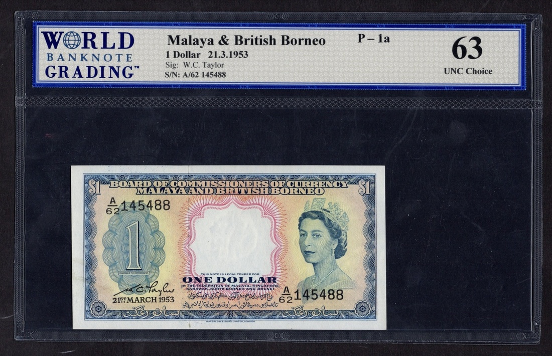 Malaya and British Borneo. Board of Commissioners. 1 Dollar. 21 March 1953. P-1a. No. A/62 145488. Blue on red and multicolor. Queen Elizabeth II at right. WBG Unc Choice 63, light soiling.
