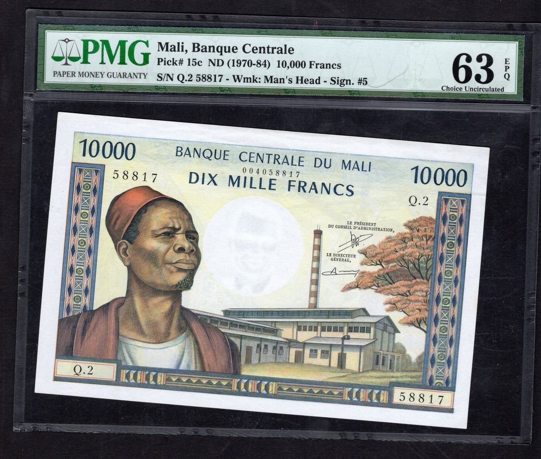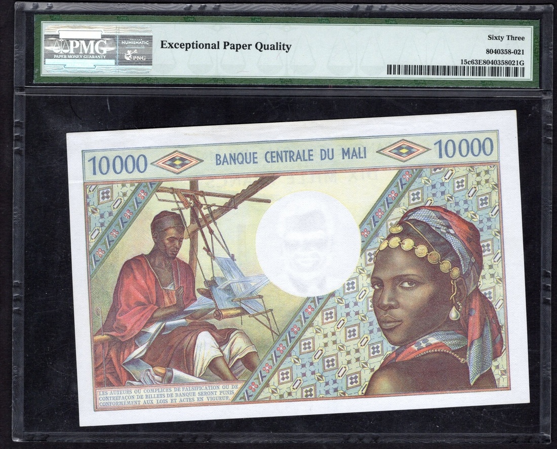 Mali. Banque Centrale. 10,000 Francs. ND (1970-84). P-15c. No. 58817. Multicolor. Man wearing fez at left, factory building lower right; Weaver left, young woman with coin headband at right. PMG Choice Uncirculated 63 EPQ.