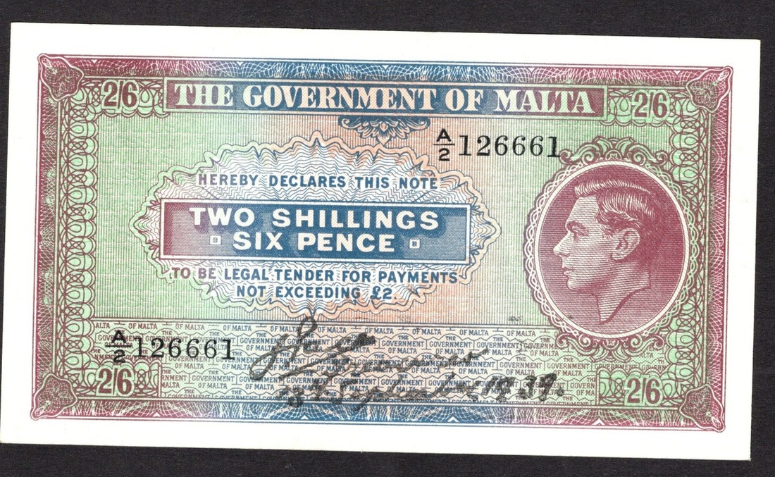 Malta. British Administration. Government of Malta. 2 Shillings 6 Pence. 1939. P-11. Violet, blue and green. George VI portrait at right. About Uncirculated.