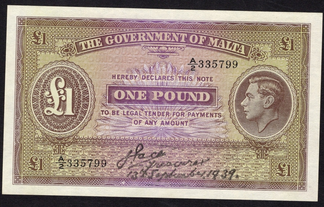 Malta. British Administration. Government of Malta. 1 Pound. 1939. P-14. Brown and purple. George VI portrait at right. Crisp Uncirculated.