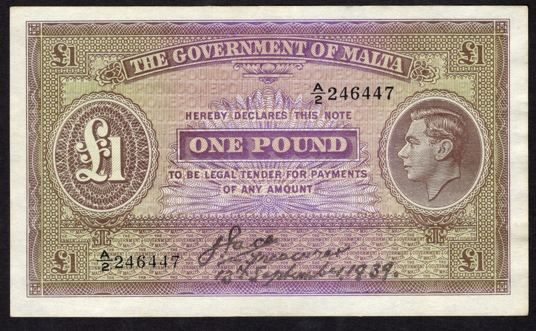 Malta. British Administration. Government of Malta. 1 Pound. 1939. P-14. Brown and purple. George VI portrait at right. Extremely Fine.