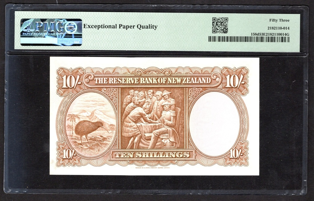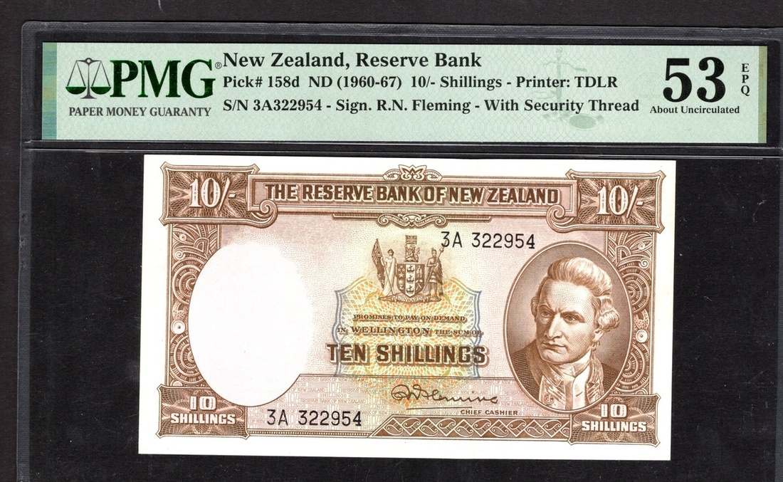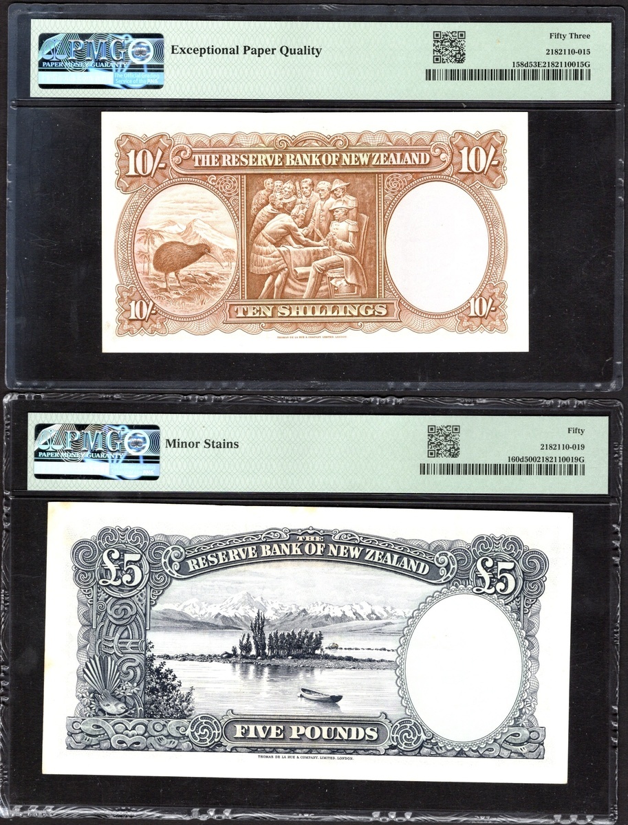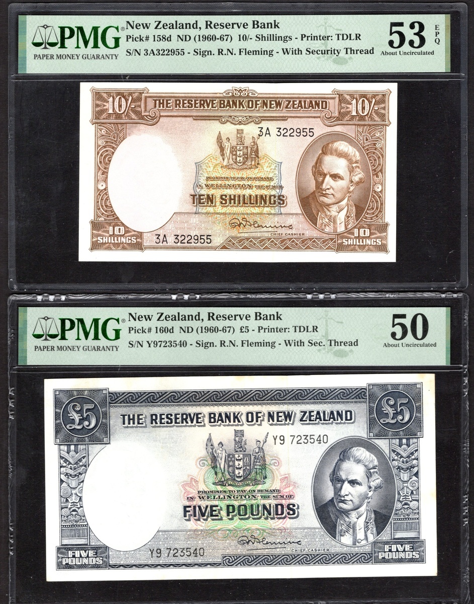 New Zealand. Reserve Bank. Trio of graded notes: 5 Pounds. ND (1960-67). P-160d. Arms at center, Captain Cook portrait at right; Lake Pukaki and Mt. Cook on back. PMG About Uncirculated 50; and consecutive pair of 10 Shillings. ND (1960-67). P-158d. PMG About Uncirculated 53 EPQ. [3]