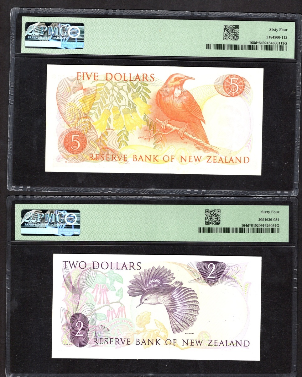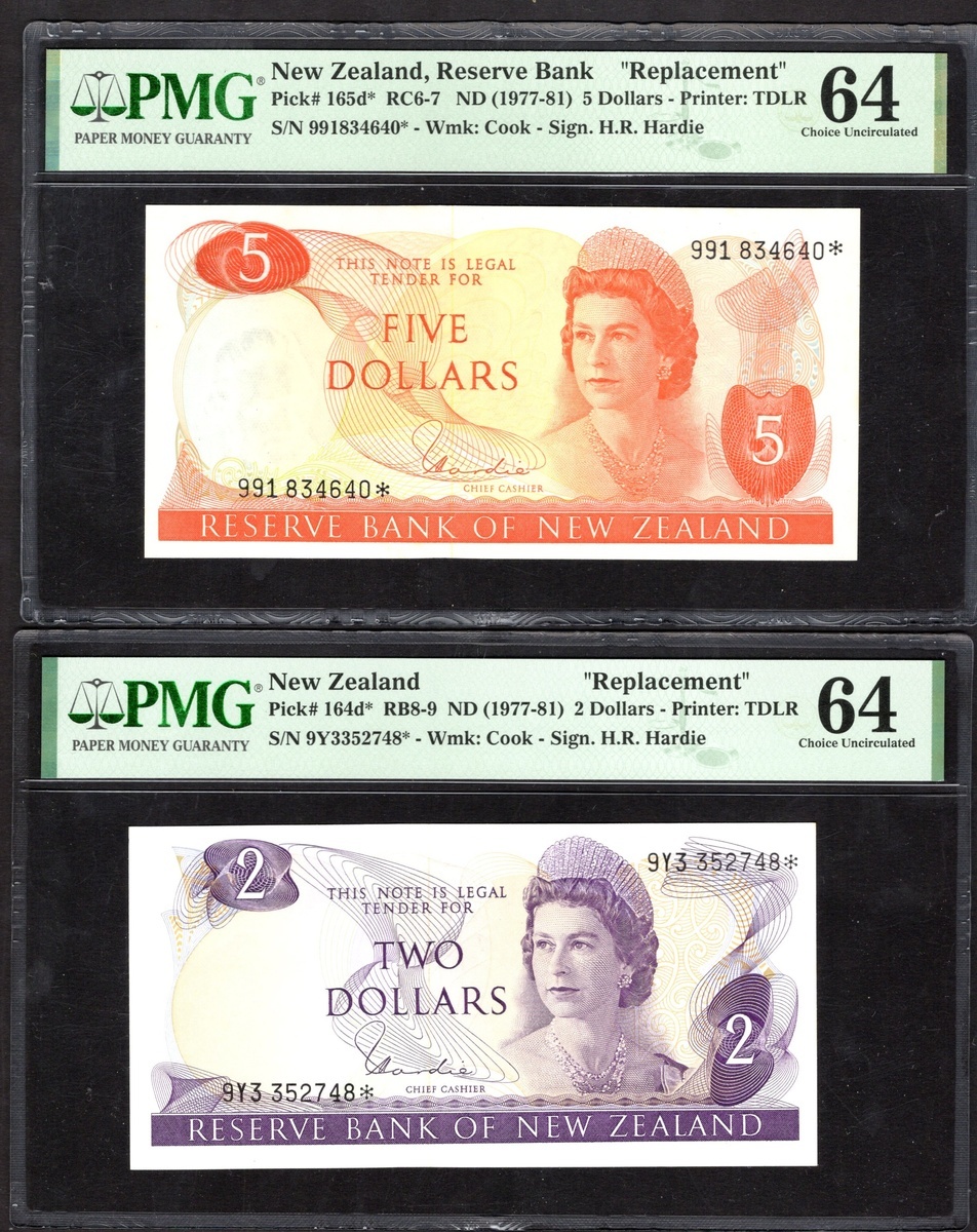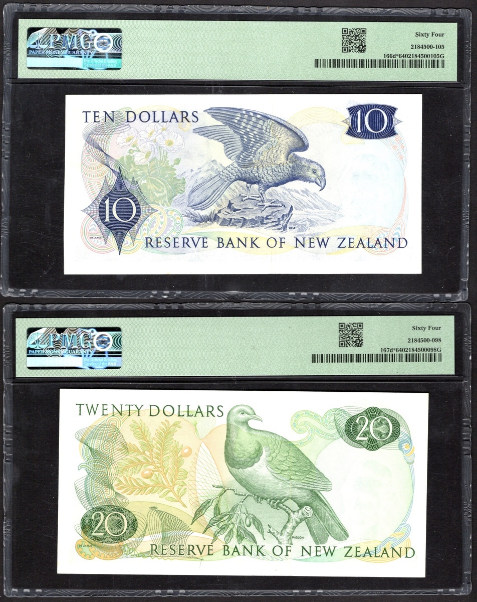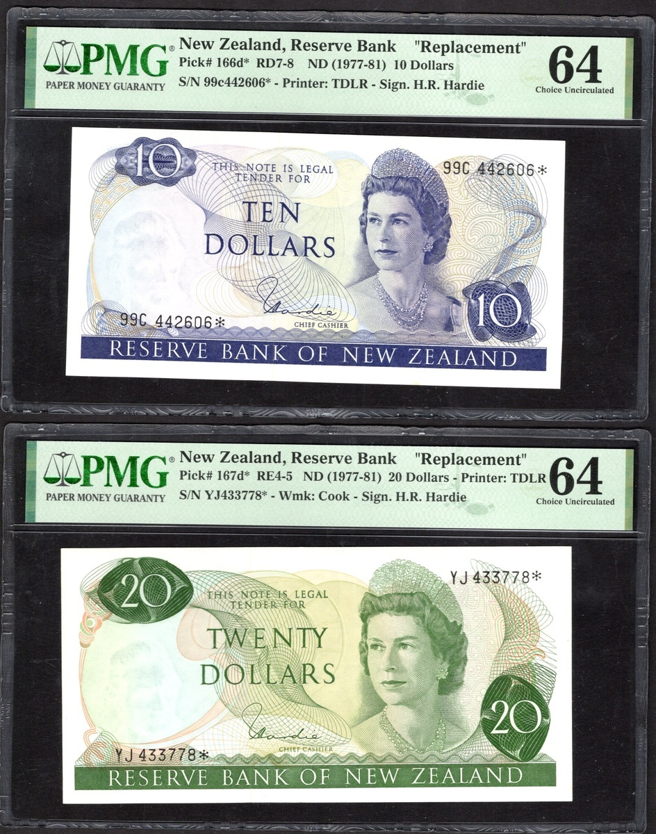 New Zealand. Reserve Bank. Quartet of ND (1977-81) series Replacement Notes: 2, 5, 10 and 20 Dollars. P-164d*, 165d*, 166d*, 167d*. Queen Elizabeth II at right; Rifleman; Tui; Kea; New Zealand Pigeon on backs. All PMG Choice Uncirculated 64. [4]