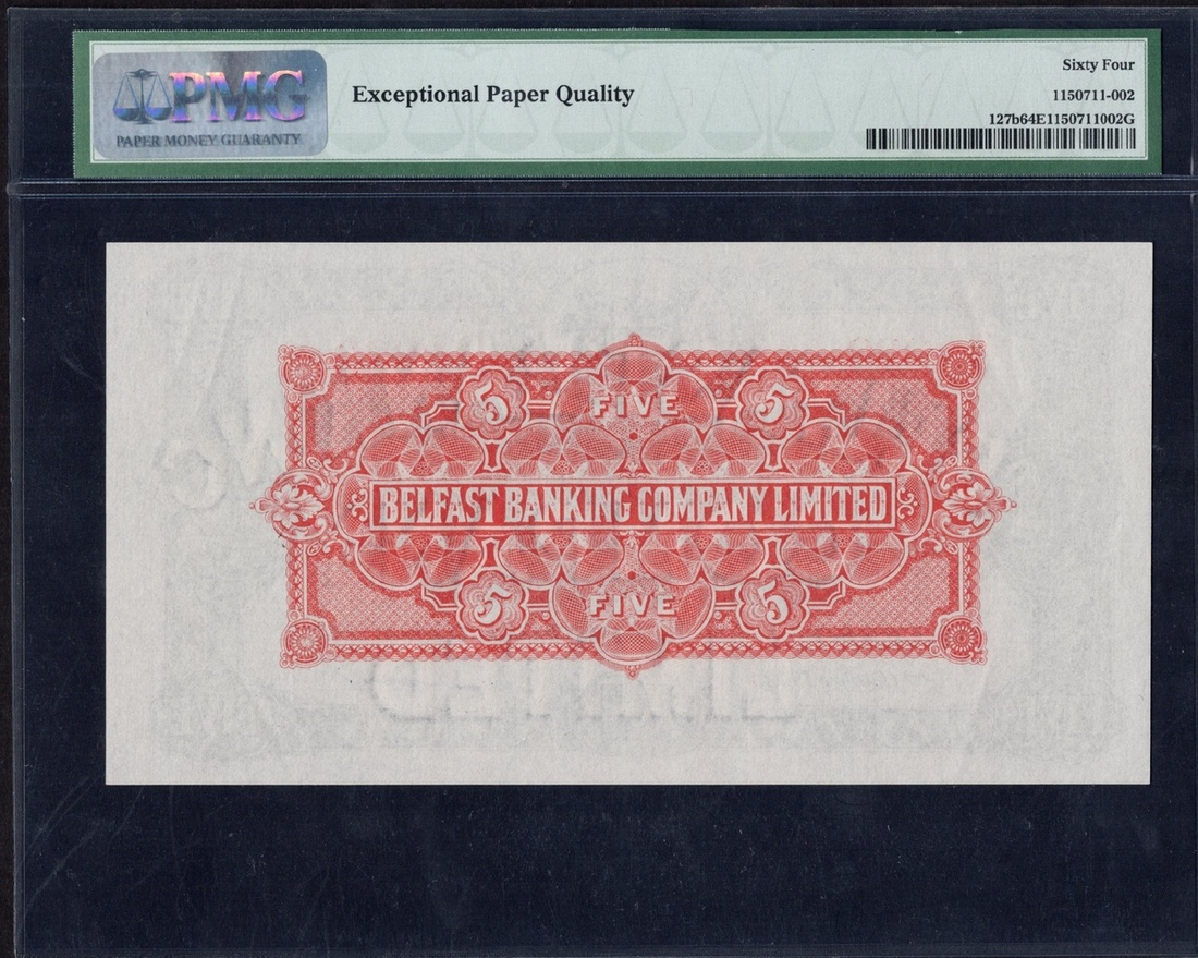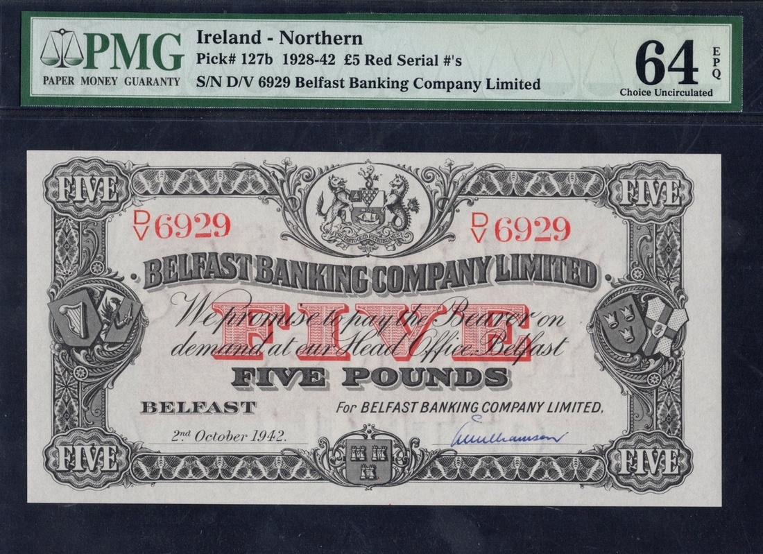 Northern Ireland. Belfast Banking Company Limited. 5 Pounds. 2 October 1942.  P-127b. No. D/V 6929. Black on red. Arms upper center. PMG Choice Uncirculated 64 EPQ.
