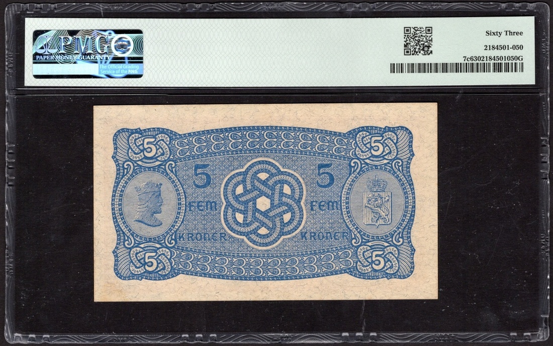 Norway. Norges Bank. 5 Kroner. 1943. P-7c. Dark blue-green on tan; blue back. President Christie portrait at left; Eternity knot back center. PMG Choice Uncirculated 63.