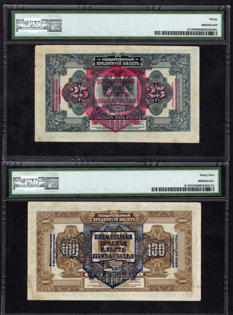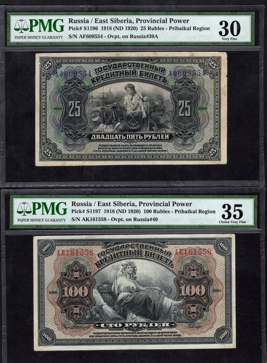 Russia. East Siberia. Provisional Power of the Pribaikal Region. 25 and 100 Rubles. 1918 (1920). P-S1196, S1197. Allegorical woman at center. Red o/p on back; blue o/p on back. PMG Very Fine 30 and Choice Very Fine 35. Ex Heritage Auction, Long Beach, September 7-11, 2017, lot 29933. [2]