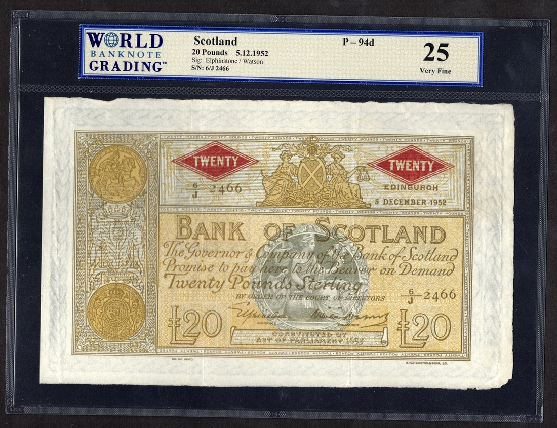 Scotland. Bank of Scotland. 20 Pounds. 5 December 1952. P-94d. No. 6/J 2466. Fortuna medallion below Arms at center, medallions in left panel. WBG Very Fine 25, staple holes.