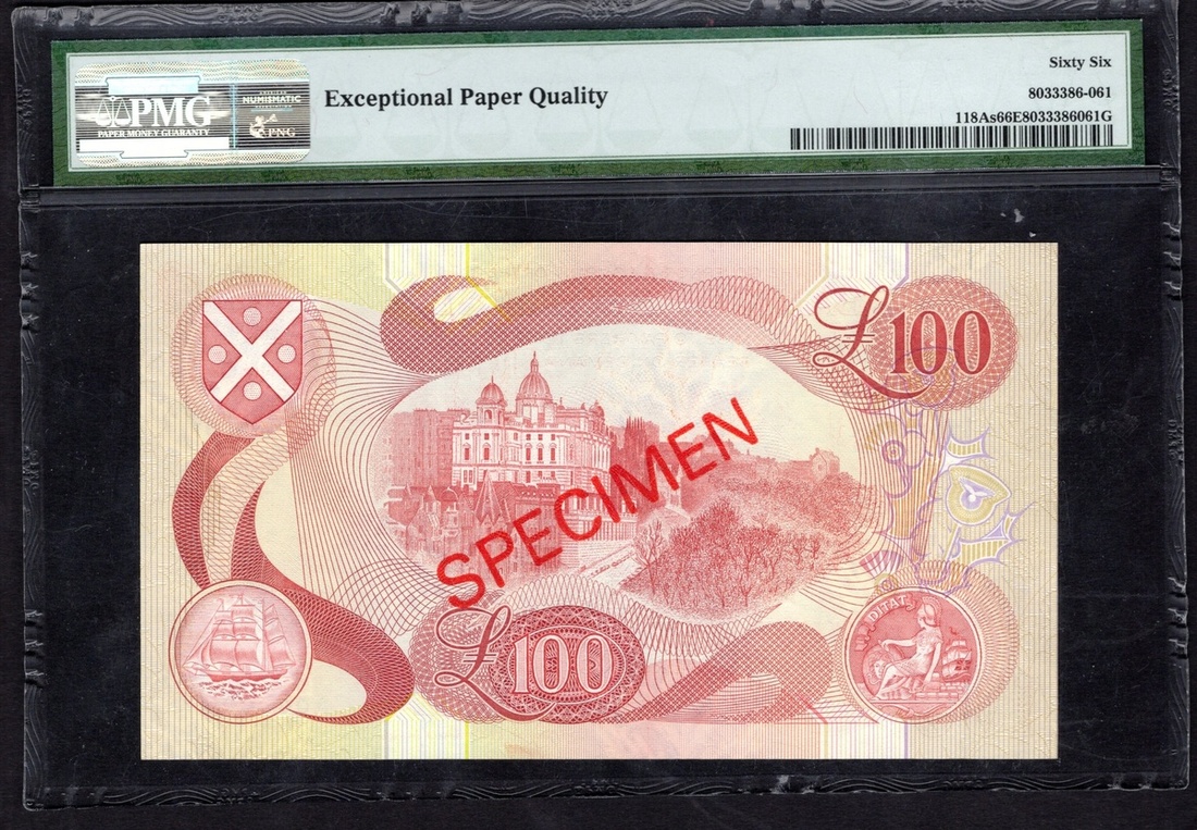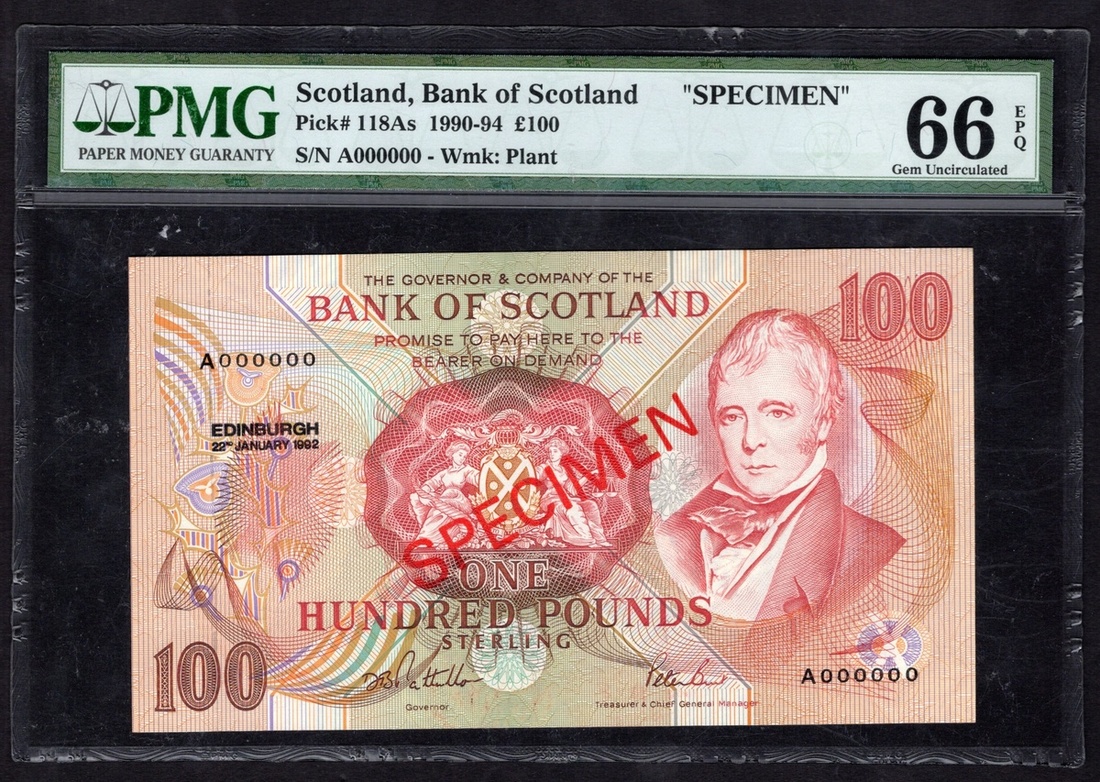 Scotland. Bank of Scotland. Specimen 100 Pounds. 22 January 1992. P-118As. No. A000000. Red on multicolor. Sir Walter Scott at right, Arms at center supported by two women; Head office building back center. Diagonal red SPECIMEN both sides. PMG Gem Uncirculated 66 EPQ.