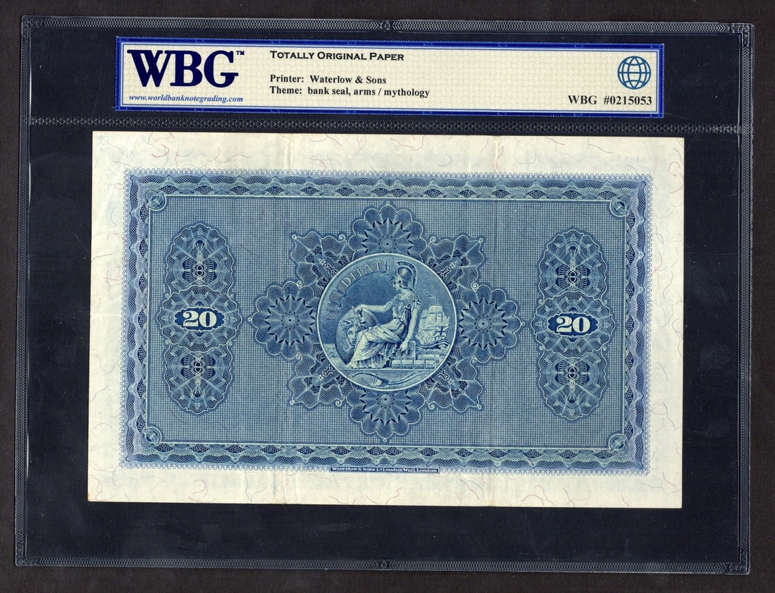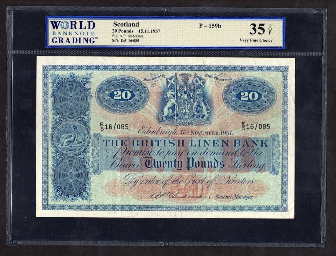 Scotland. British Linen Bank. 20 Pounds. 15th November 1957. P-159b. No. E/5 16/085. Blue and red; blue back. Bank Arms upper center, Britannia seal at left; Britannia center back. WBG Very Fine 35 TOP.