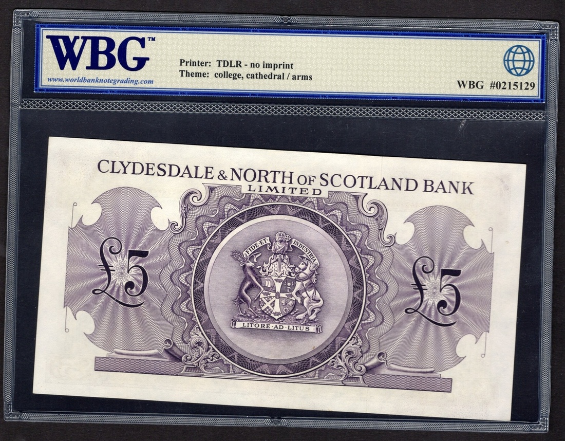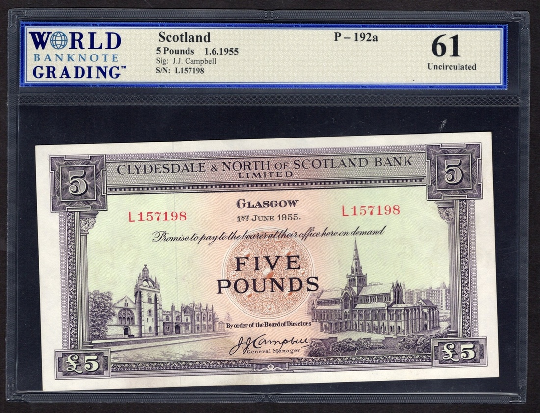 Scotland. Clydesdale & North of Scotland Bank. 5 Pounds. 1 June 1955. P-192a. No. L157198. Violet-brown on multicolor. King's College in Aberdeen at lower left, Glasgow Cathedral lower right; arms back center. WBG Uncirculated 61.