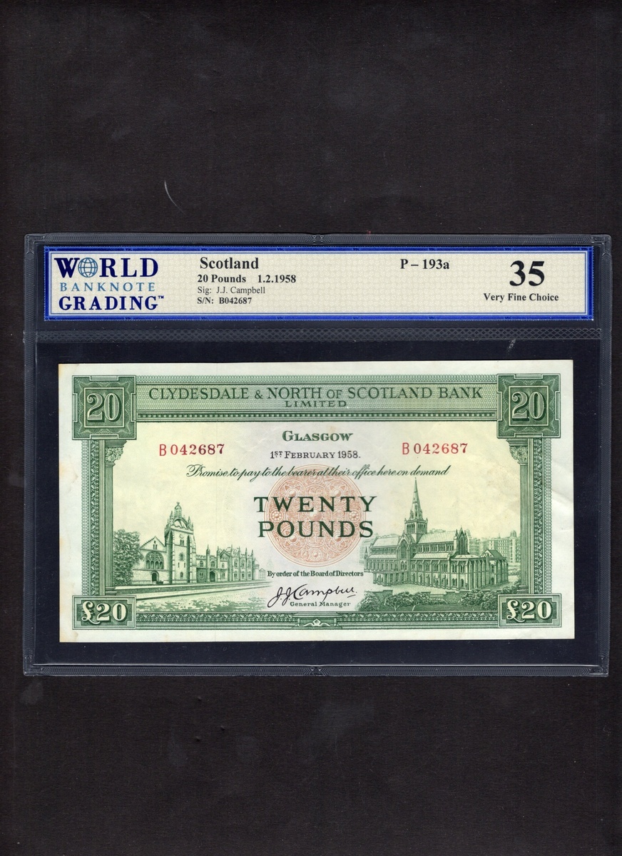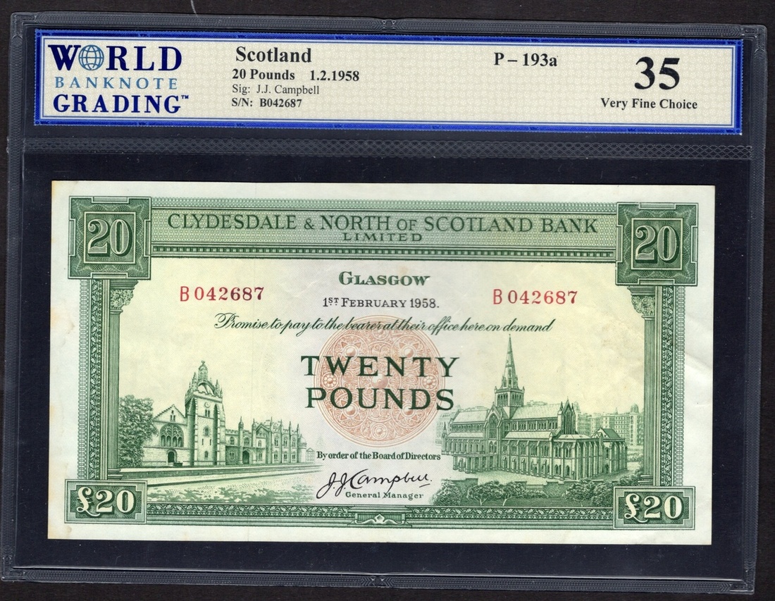 Scotland. Clydesdale & North of Scotland Bank. 20 Pounds. 1 February 1958. P-193a. No. B042687. Signature: J.J. Campbell. Green on multicolor. King's College in Aberdeen at lower left, Glasgow Cathedral lower right; arms back center. WBG Very Fine Choice 35; margin staining.