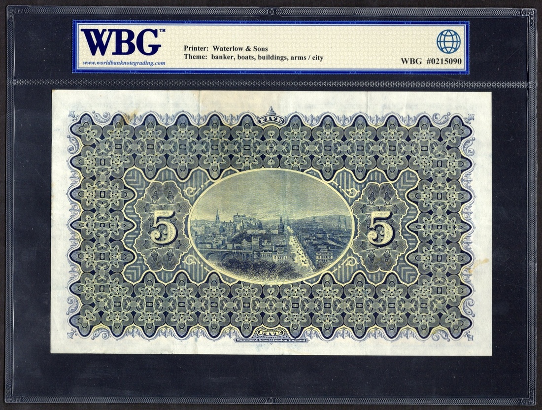 Scotland. National Bank of Scotland. 5 Pounds. 31st December 1956. P-259d. No. E552-610. Deep blue, orange-brown and yellow. Marquess of Lothian at left, Arms upper center, vignettes of harbor, town and castle; cityview on back. WBG Very Fine 30.