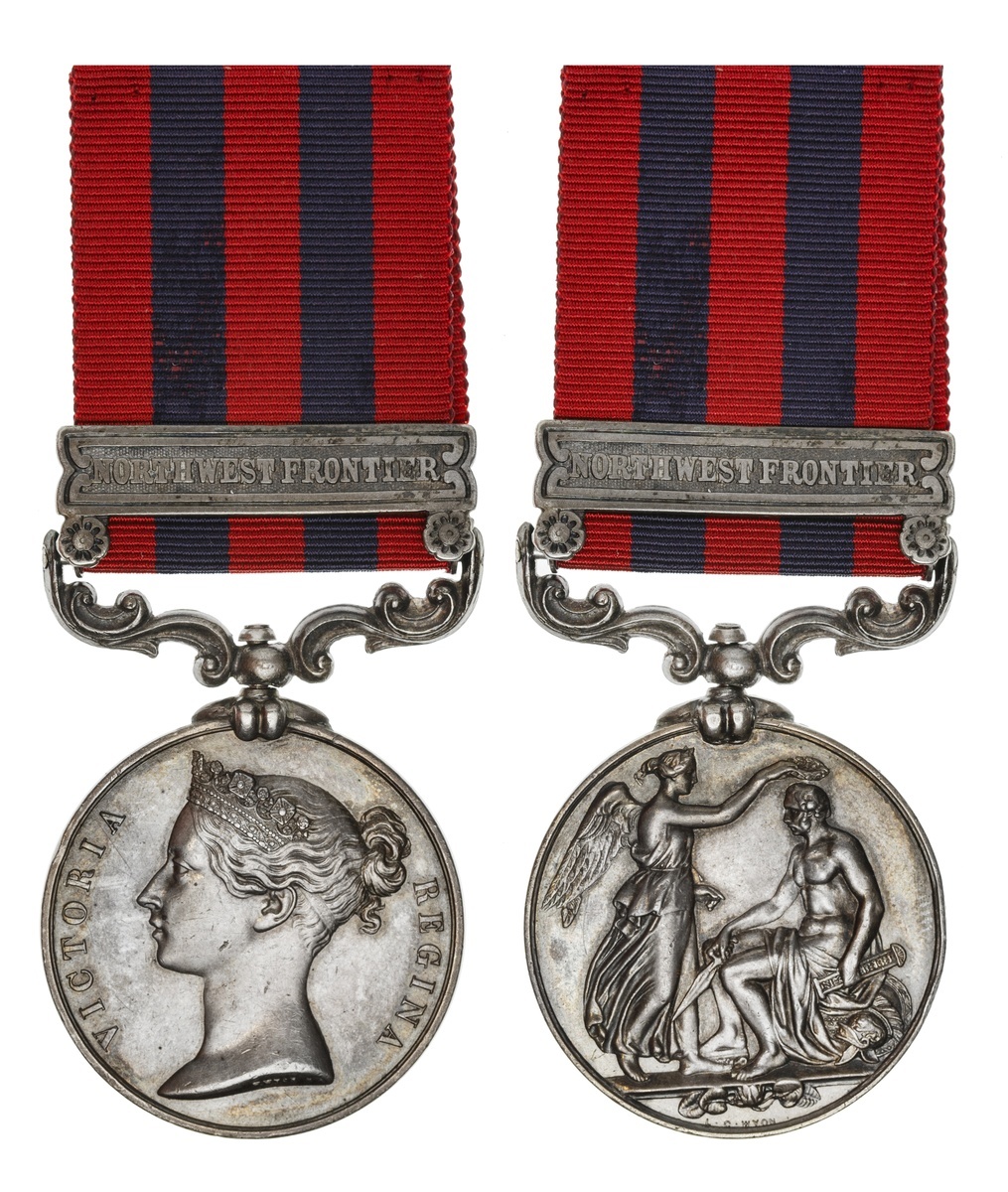 Great Britain. India General Service Medal, 1854-1895. One clasp: "Northwest Frontier" (1202. A FOSTER H M'S 1ST BN 6TH REGT). Impressed. On ribbon. Toned over minor contact marks. Extremely Fine.