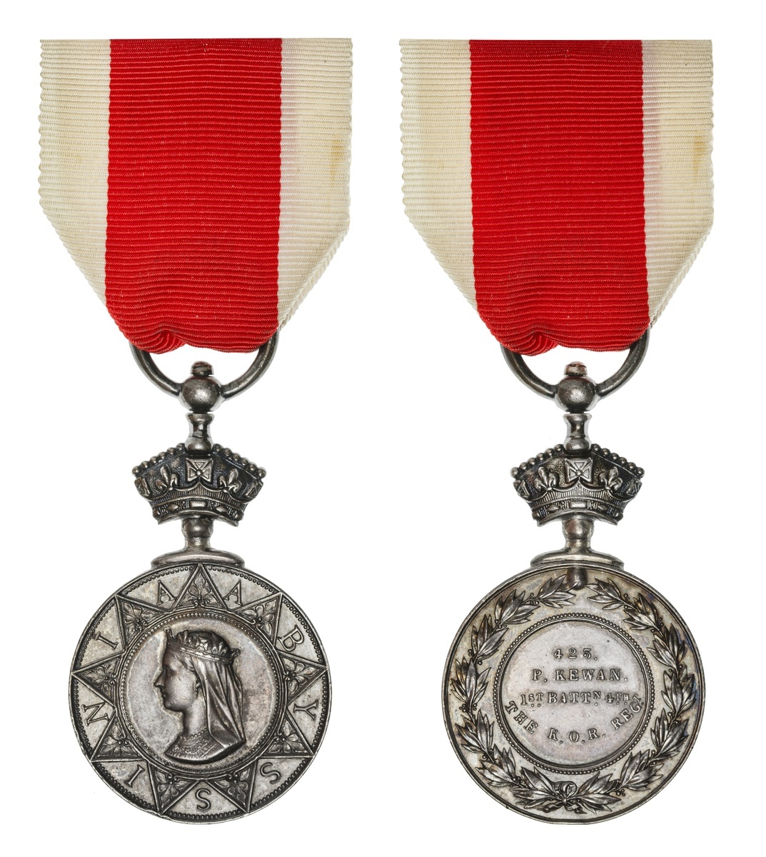 Great Britain. Abyssinian War Medal, 1867-1868. 423 P. KEWAN. 1ST BATTN. 4TH THE K.O.R. REGT. embossed reverse center. On ribbon. Small rim bump. Slate gray tone. Extremely Fine.