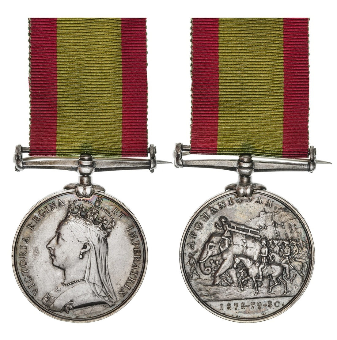 Great Britain. Afghanistan Medal, 1878-1880. No clasp (10 B/1108 SERGT C.T. CROWTHER. 2ND BN. 14TH REGT.). Engraved. Pinback added to swivel bar. On ribbon. Once lightly polished. About Extremely Fine.