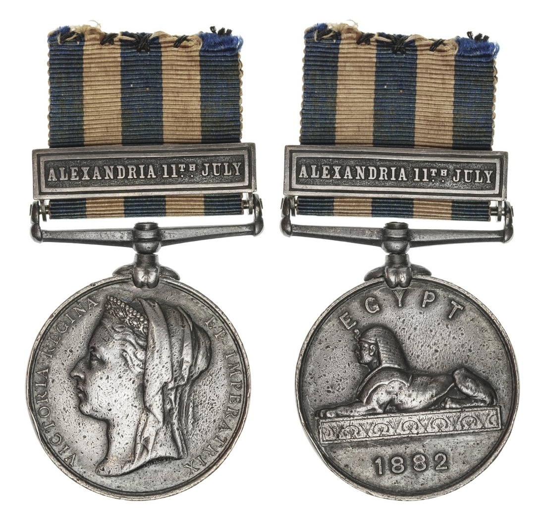 Great Britain. Egypt Medal, 1882-1889. Dated 1882. One clasp: "Alexandria 11th July" (E.C. BISHOP LG. SEAN H.M.S. INVISIBLE). Engraved. On original ribbon. Edge bruise and numerous contact pecks. About VF.