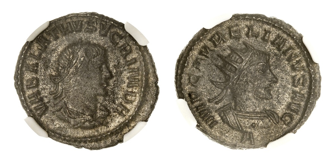 Palmyrene Kingdom. Vabalathus with Aurelian (270-275). Billon Antoninianus, first officina, 270-272. 3.48 gms. Radiate and cuirassed bust of Aurelian right, A below, rev. Laureate, draped and cuirassed Vabalathus bust right. RIC 381. NGC Ch VF; Strike: 4/5, Surface: 3/5.