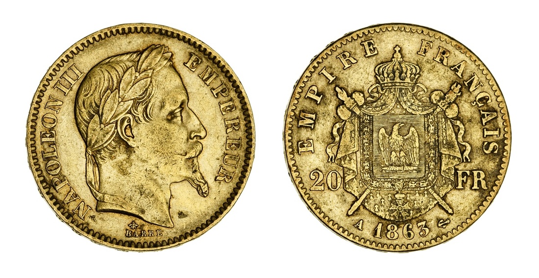 France. Napoleon III (1852-1870). 20 Francs, 1863 A. Paris. Laureate head right, rev. Crowned and mantled Arms, crossed scepters behind. KM 801.1. Tiny obverse adhesion. Very Fine.