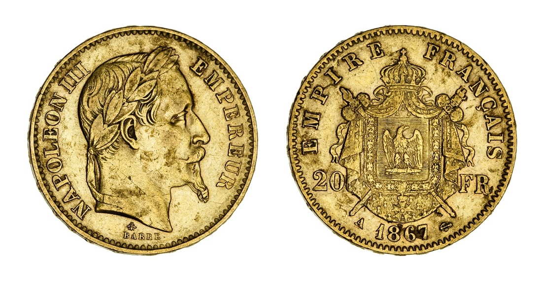 France. Napoleon III (1852-1870). 20 Francs, 1867 A. Paris. Laureate head right, rev. Crowned and mantled Arms, crossed scepters behind. KM 801.1. Very Fine.