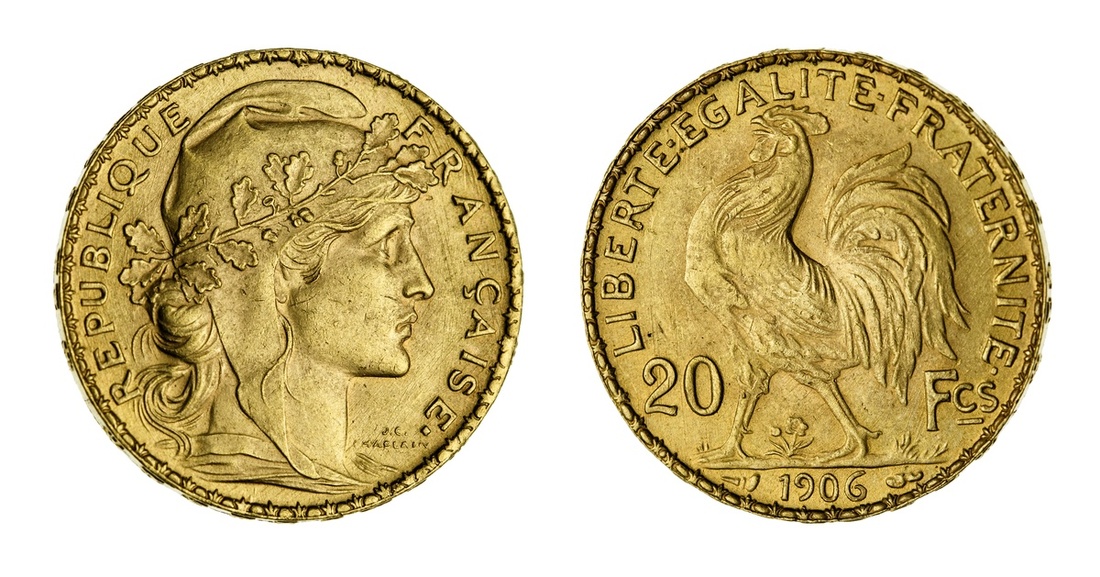 France. Third Republic. 20 Francs, 1906. Marianne by Chaplain right, rev. Rooster left. KM 847. Uncirculated.