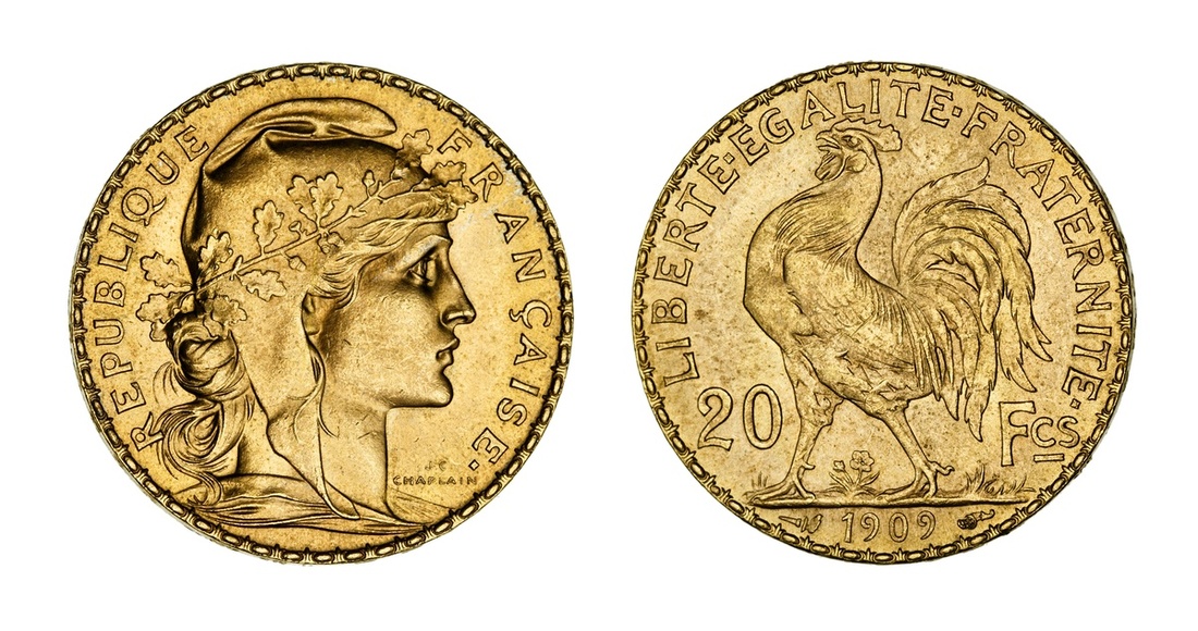 France. Third Republic. 20 Francs, 1909. Marianne by Chaplain right, rev. Rooster left. KM 857. Uncirculated.