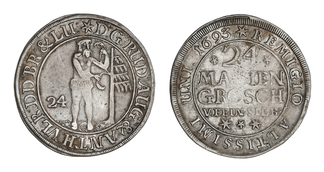 German States. Brunswick-Wolfenbüttel. Rudolf August and Anton Ulrich (1685-1704). 24 Mariengroschen, 1693. Wildman standing standing ¾ right, holding tree with both hands, rev. Value within inner circle. KM 559. Slate-gray tone. Very Fine.