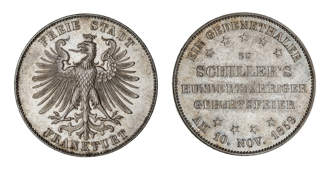 German States. Frankfurt. Freie Reichsstadt. Taler, 1859. Schiller Centennial. Franconian eagle, rev. Four-line central legend. KM 359. Attractively toned. Choice Uncirculated.