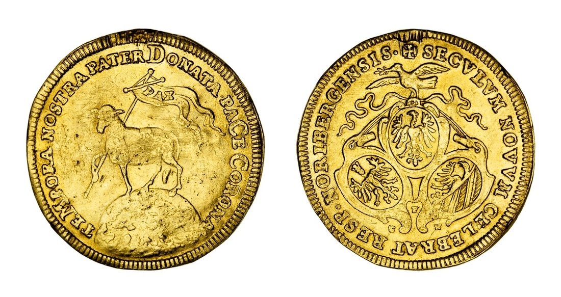 German States. Nürnberg. Freie Reichsstadt. Ducat, chronogram date MDCC (1700). GFN. Triplex of Arms, rev. Paschal lamb standing left atop globe. Fr.1885, KM 257. Mount removed at 12:00. Extremely Fine details.