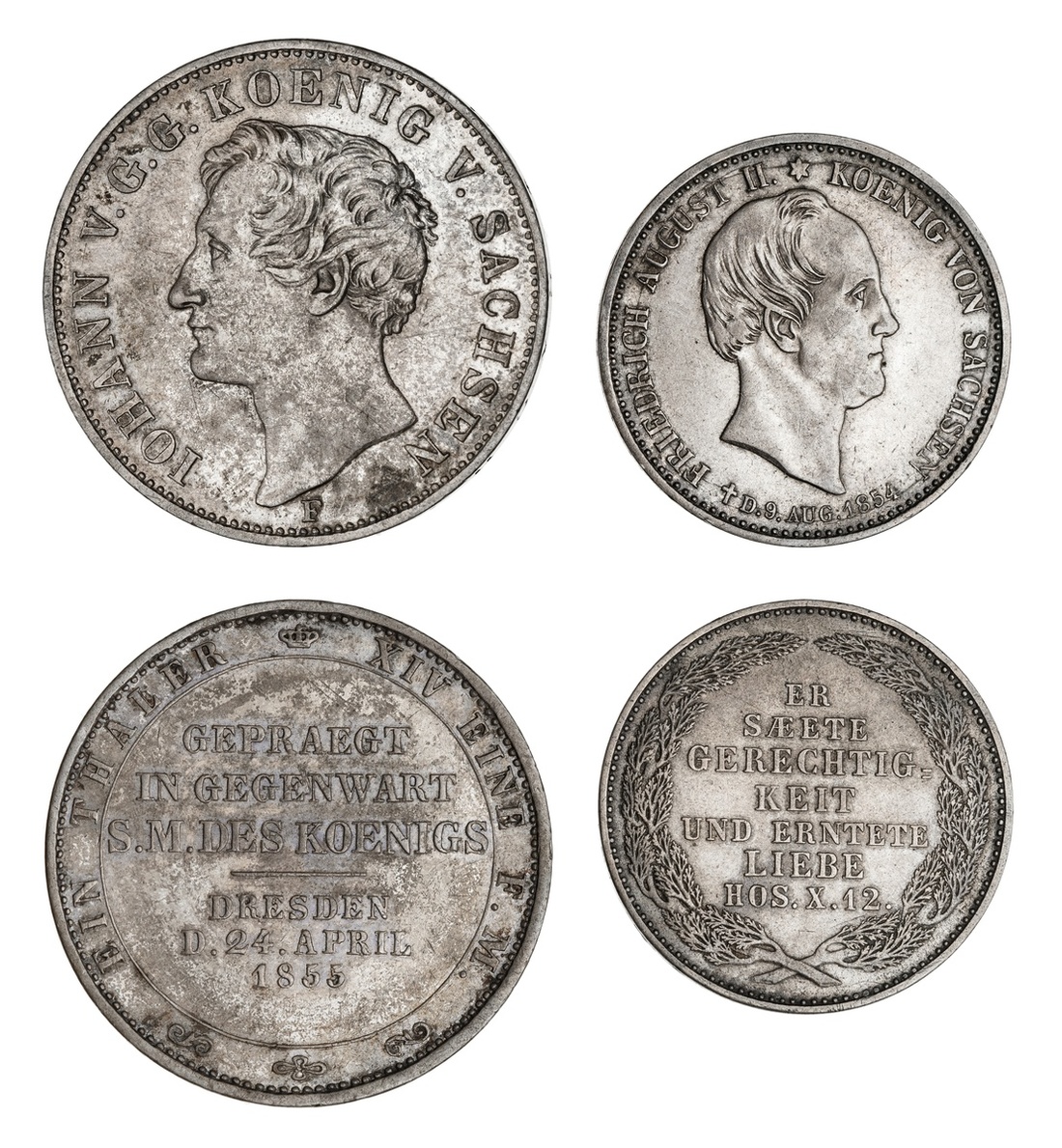 German States. Saxony. Johann (1854-1873). Taler, 1855 F. On the King's Visit to the Mint. Bare head left, rev. Mint visit legend. KM 1187. Toned over a few old friction marks. Very Fine; also 1/3 Taler, 1854. On the Death of Friedrich August II. Bare head right, rev. Seven-line legend. KM 1179. Very Fine. (2)