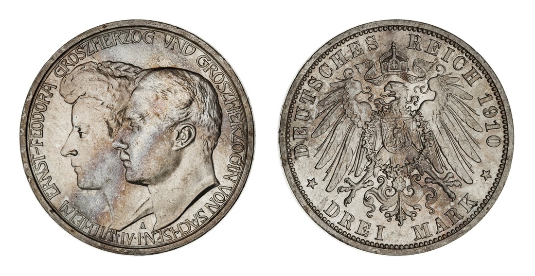 German States. Saxe-Weimar-Eisenach. Wilhelm Ernst (1901-1918). 3 Mark, 1910. On the Grandduke's Second Marriage. Conjoined heads of Wilhelm Ernst and Feodora left. KM 221. Toned. Uncirculated.