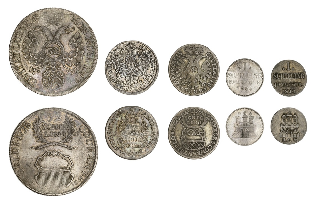 German States. Hanseatic Lot. Lübeck. 32 Schillings, 1738 JJJ. KM 154. Toned. About EF; 4 Schillings, 1728. Fine; Hamburg. 1 Schilling, 1840, 1855; 4 Schillings, 1727. Abut EF-EF. (5)