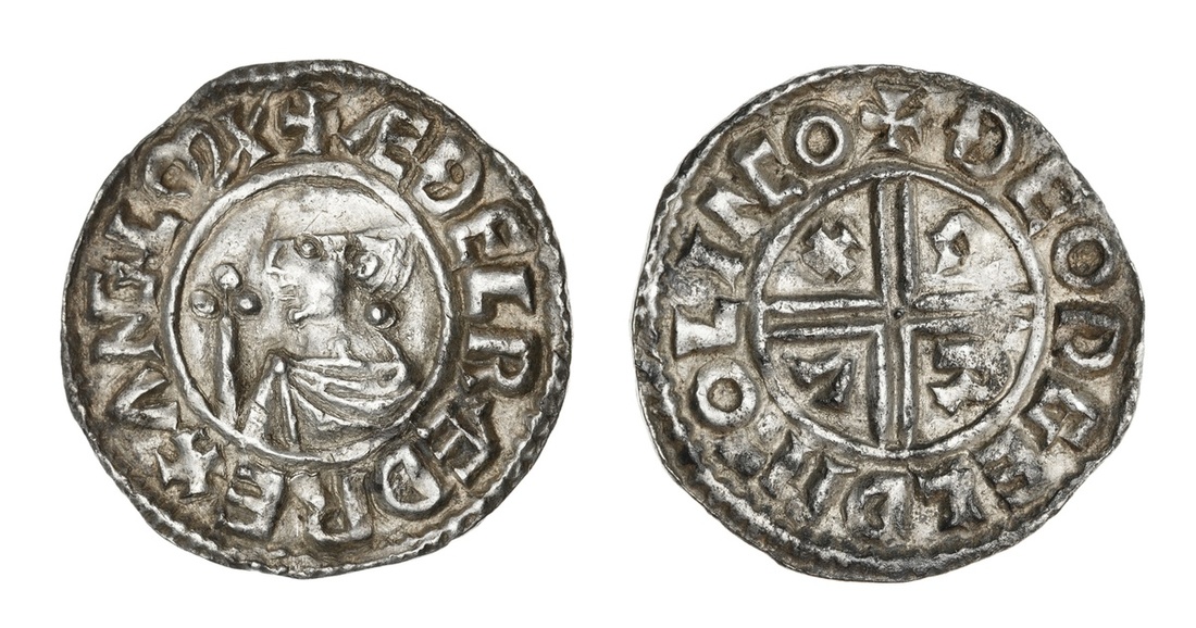 England. Late Anglo-Saxon. Aethelred II (978-1016). Crux Penny. Moneyer: Lincoln; Theodgeld. 1.68 gms. Bare-headed bust left, scepter before; +AEDELRED REX ANGLOX, rev.Short voided cross with CRVX in angles; +DEODGELD M:O LINCO. N.770, S.1148. Top of head weakly struck. Very Fine.