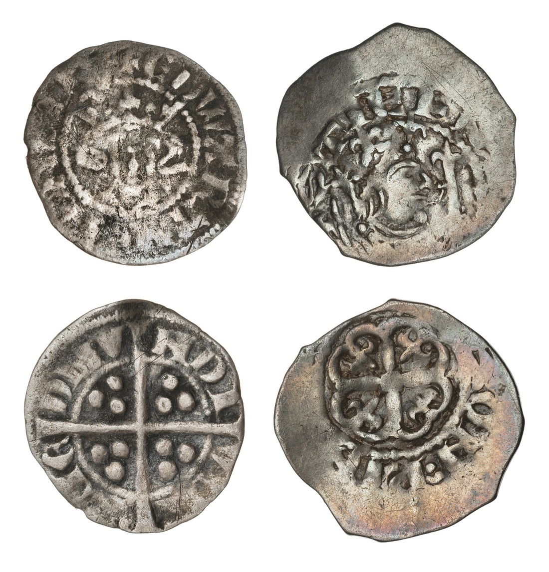 England. Norman Kings. Stephen (1135-1154). Cross Moline ("Watford") Penny. Winchester. 1.32 gms. Crowned and diademed bust right holding scepter; STIEFN(E)--, rev. Cross moline, fleur in each angle; --ON PIN---. N.973, S.1278. Good Fine; also Plantagenets. Edward II (1307-1327). Penny. Bury St. Edmunds. Some deposits. About Fine. (2)