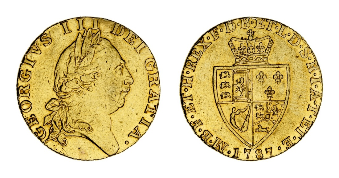 Great Britain. George III (1760-1820). Spade Guinea, 1787. Laureate head right, rev. Crowned Arms on spade-shaped shield. S.3729, KM 609. Once lightly polished. EF details.