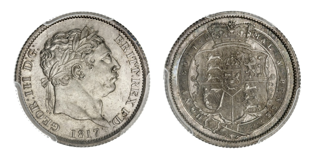 Great Britain. George III (1760-1820). Shilling, 1817. Laureate head right, rev. Crowned Arms in Garter. ESC 2140, S.3790, KM 666. PCGS MS 64+.