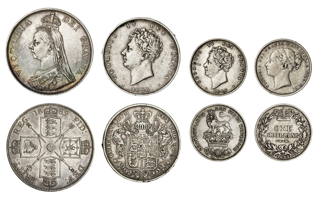 Great Britain. George IV (1820-1830). Shilling and Halfcrown, 1826. Bare head left, revs. Lion-topped crown; Helmed Arms with motto. KM 694, 695. VF, the latter with obverse scratch; also, Victoria. Double Florin, 1889. KM 763. Hairlines, About EF; and Shilling, 1883. Fine. (4)