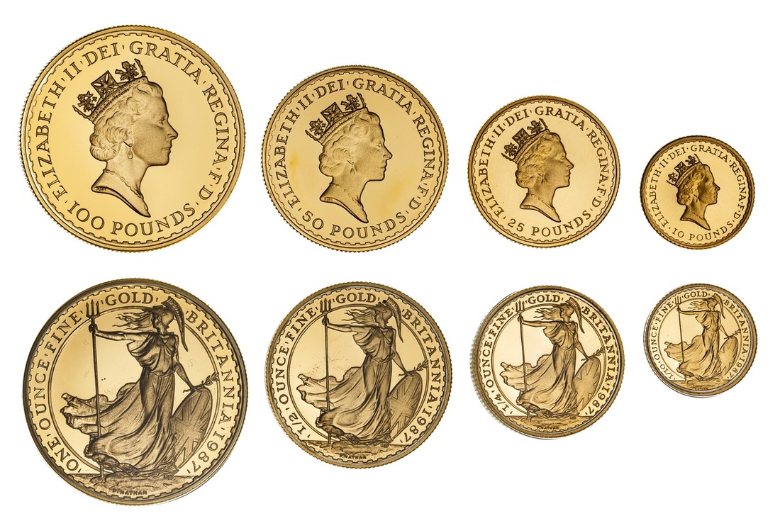 Great Britain. Elizabeth II (1952-2022). 1987 4-piece Gold Proof Set. 10 Pounds-1/10 Ounce, 25 Pounds-¼ Ounce, 50 Pounds-½ Ounce, and 100 Pounds-1 Ounce. Crowned bust by Maklouf right, revs. Britannia. With CoA in original RM black case. Choice Brilliant Proof.