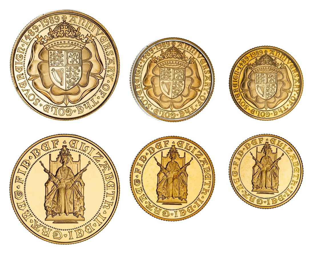 Great Britain. Elizabeth II (1952-2022). 1989 3-piece Gold Proof Set. 500th Anniversary of the Gold Sovereign. Designs adapted from the original sovereign. The queen seated facing at her coronation, revs. Crowned Arms set on a double rose. With CoA in original RM red case. Choice Brilliant Proof.
