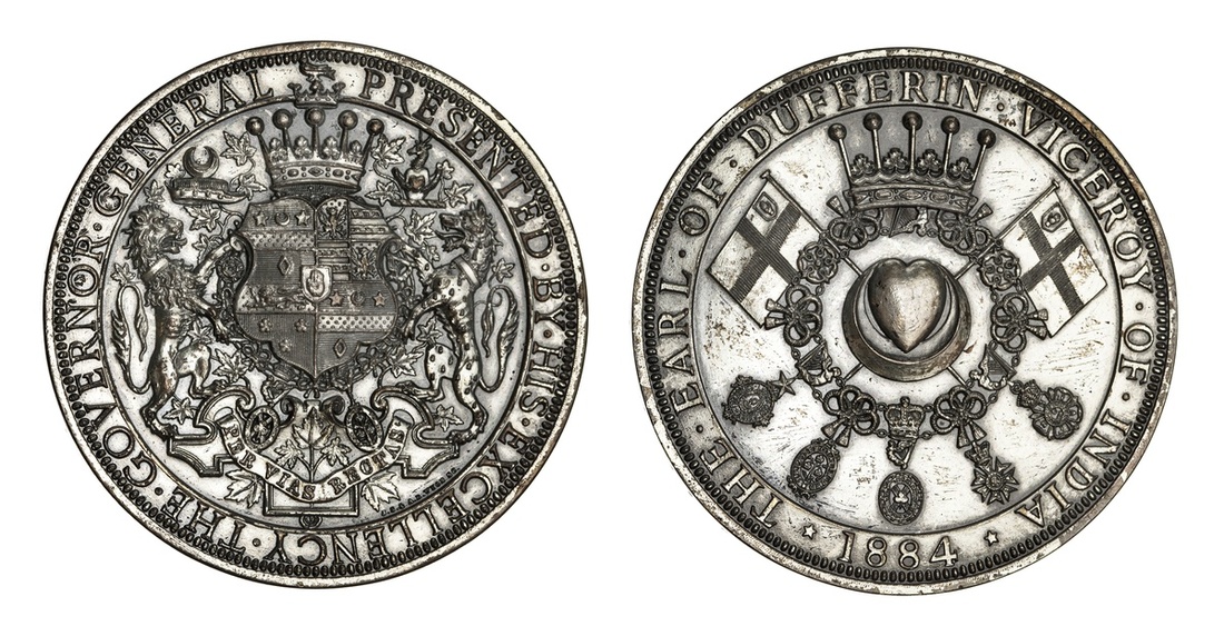 British India. Earl of Dufferin's Viceroy Presentation Medal 1884. Silvered Bronze, 50.5mm. Lord Dufferin's crowned and supported Arms, rev. Heart and crescent, coronet and standards above. Encircled by the Earl's Orders of chivalry. Unnamed. Toned. Choice Extremely Fine.