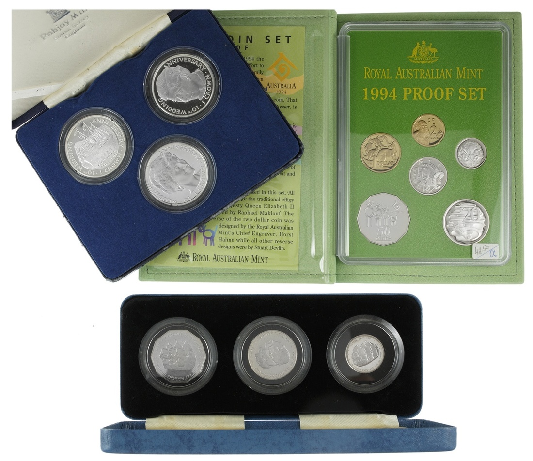 Trio of World Proof Sets. Australia. 6-piece 1994 Proof Set; Dominican Republic. 3-piece 1983 Proof Set. KM PS-19; and Gibraltar. 1991 3-piece Silver Crown Proof Set. 10th Anniversary of Prince Charles and Lady Diana's Wedding. Pobjoy Mint issue. All in cases of issue (the latter well scuffed). Brilliant Proof.