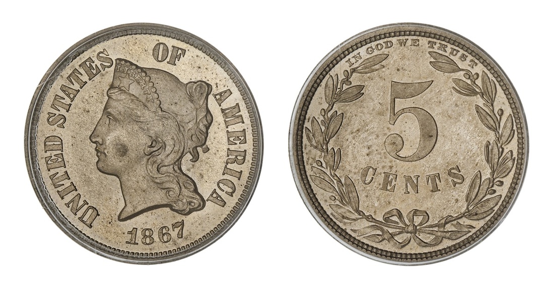 Pattern 5 Cents, 1867. Nickel. Judd-570, Pollock-638. R-5. Liberty head left wearing coronet with single star, digit "7" in date distant from lowest hair curl, rev. Value within open laurel wreath. Reportedly 50 struck. PCGS PR65 CAM with CAC. Ex Stack's-Bowers Nov. 15, 2022 online auction, lot 91263.