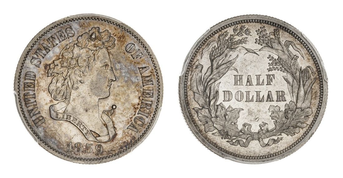 Pattern Half Dollar, 1859. Silver. Reeded edge. Judd-237, Pollock-293. R-4. Longacre design. Liberty head right wearing wreath of oak and vine leaves, ribbon inscribed LIBERTY around neck, UNITED STATES OF AMERICA around, date below, rev. Value within 'cereal' wreath of cotton, tobacco, sugar cane, corn, wheat, and oak leaves. PCGS PR55. Ex Stack's-Bowers Dec. 16, 2020 online auction, lot 92473.