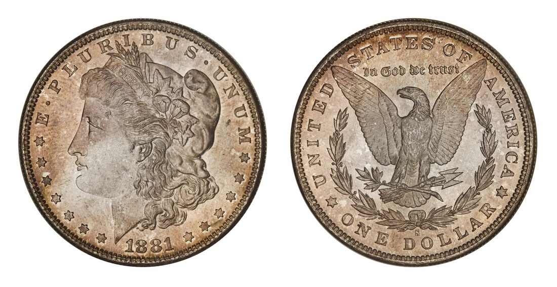 1881-S Morgan Dollar. In 2012 PCI holder as MS 67. Attractive pale lavender tone with bold lustre. Some minor stacking marks. Very Choice BU.