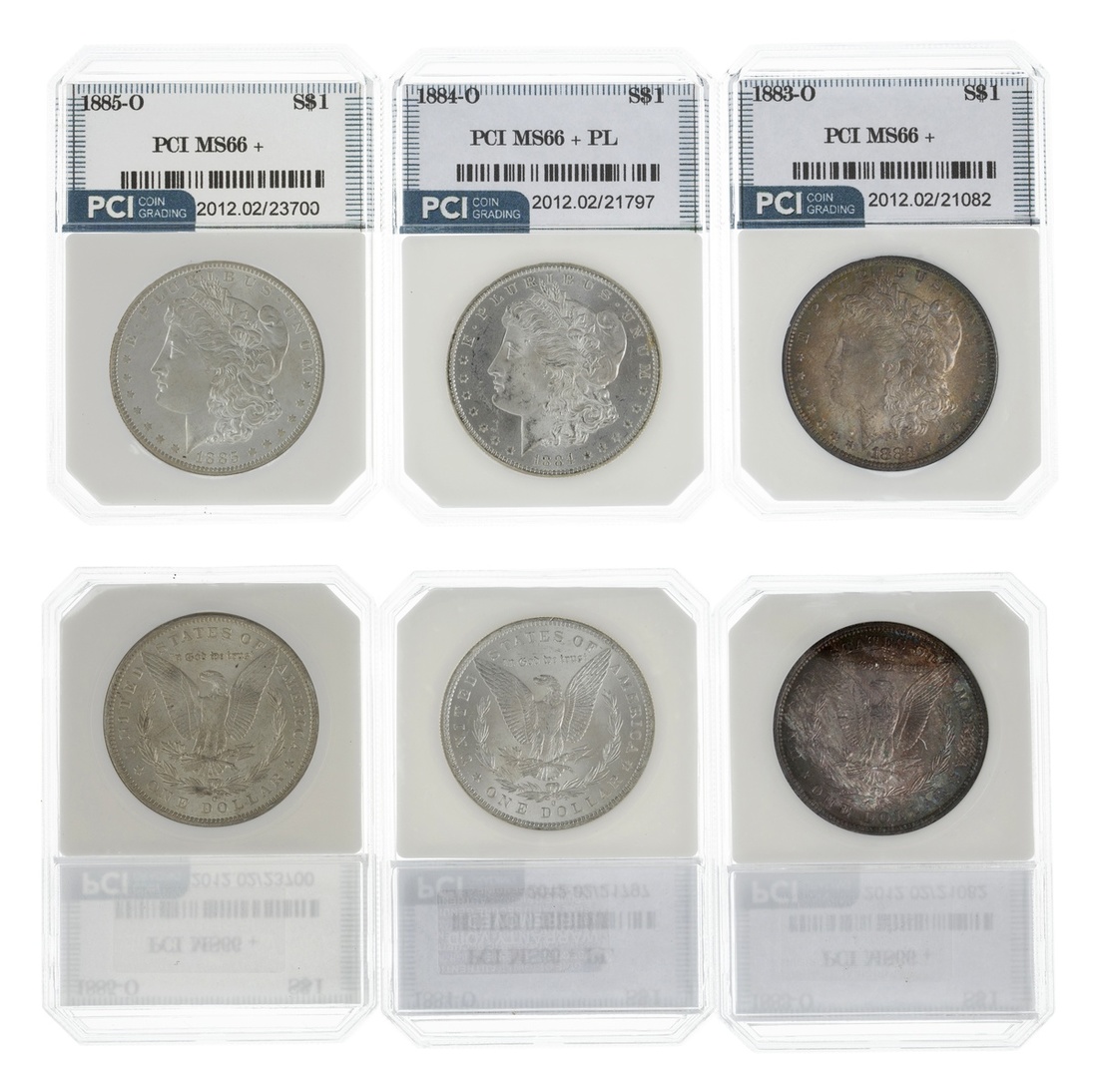Trio of New Orleans mint Morgan Dollars. 1883-O, 1884-O, and 1885-O. All in 2012 PCI holders as MS 66+. The first attractively toned, light stacking marks. Choice BU, the second obverse bagmarks, frosty white, Choice BU. The latter Very Choice BU. (3)