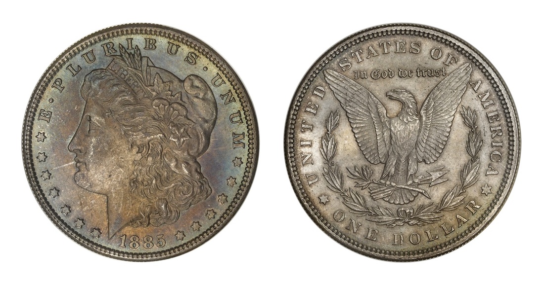 1885 Morgan Dollar. In 2012 PCI holder as MS 66+. Pleasing iridescent hues. Very Choice BU.