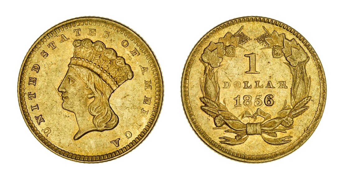 1856 Gold Dollar. Slanted "5". Uncirculated. Decent lustre over minor hairlines.