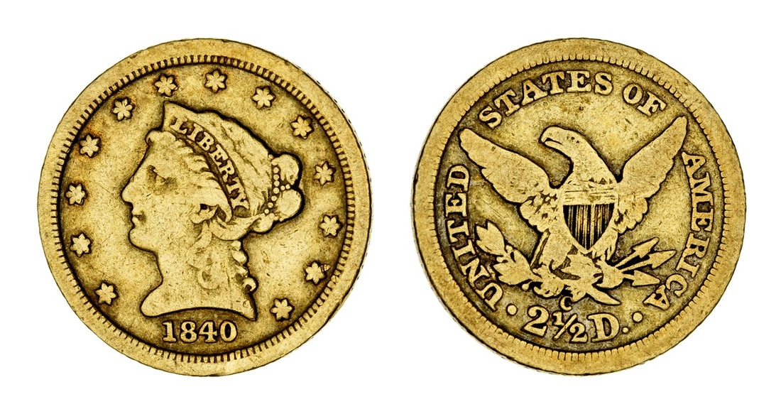 1840-C Liberty head $2 ½. About Very Good. Just 12,822 pieces struck by the Charlotte mint for this year.