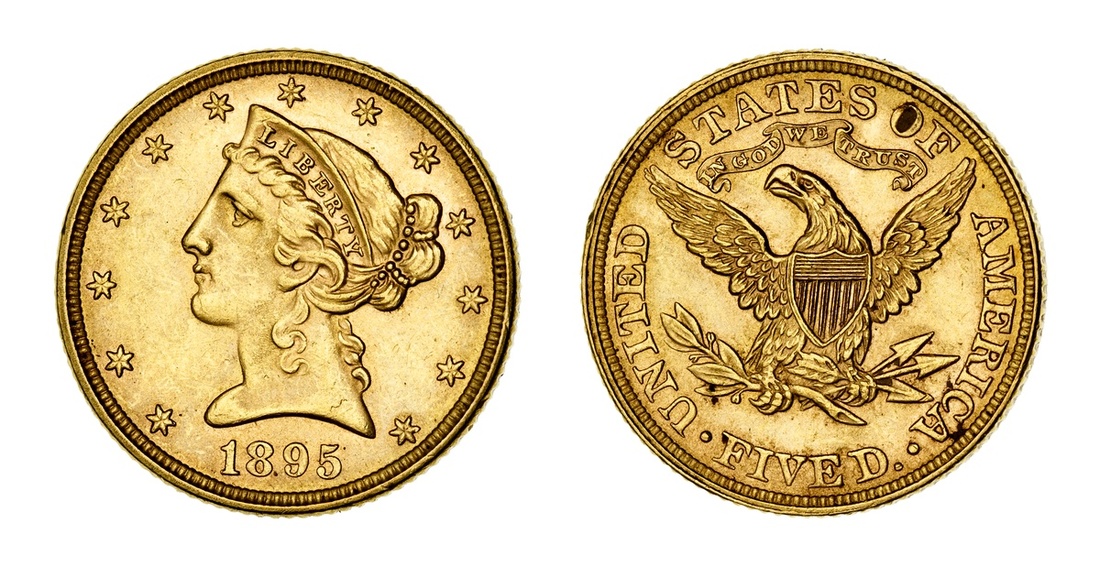 1895 Liberty Head $5. About Uncirculated. Spot of residue in the "O" of "OF".