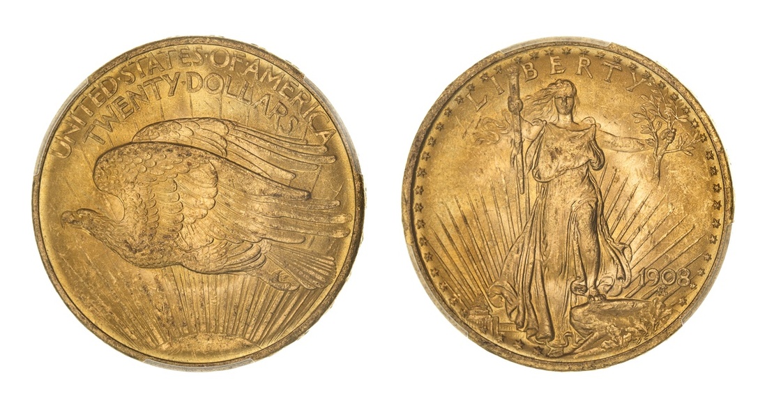 1908 $20 St. Gaudens. No Motto. PCGS MS 63.