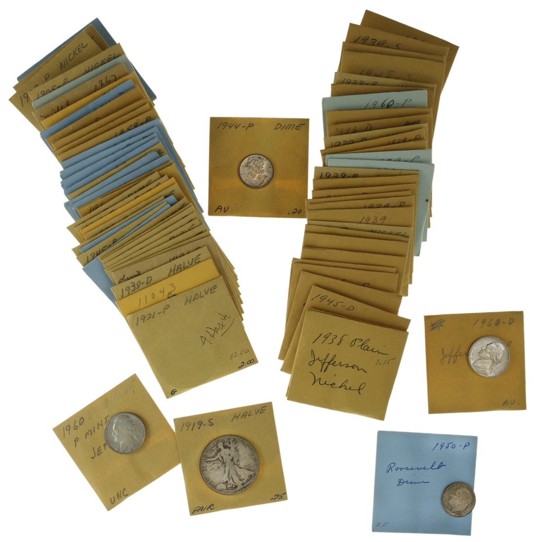 Lot of Silver Dimes, Quarters and Half Dollars. Dimes (23) - Liberty seated (2), Barber (6), Mercury (8), Roosevelt (7); Quarters (11) - Barber, Washington (10); Walking Liberty Half Dollars, 1919-S, 1921, 1938-D and 1943-S. Good; also: Nickels - Shield, Liberty (4), Buffalo, and Jefferson (47). About Good to Uncirculated.